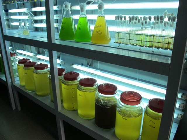 algae Published November 9, 2012 at 640 × 480 in A Familiar (Fish) Face and the Language of Science Bubble bubble…vials of algae soon to become shrimp food.