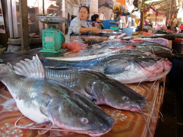 My co-worker Mout and I meandered through three different markets so I could film the different species of fish for sale. And I have to say, some of these fish from the Mekong are huge! Catfishes two and a half feet long. Granted, that’s nothing compared to the true Mekong giant catfish, a species that can grow more than ten feet long. Still, these big guys are far larger than anything I’ve seen at any grocery store. It’s impressive to think how many of these hefty fish are swimming around in the river—and how there were probably even more, even bigger fish in the past.