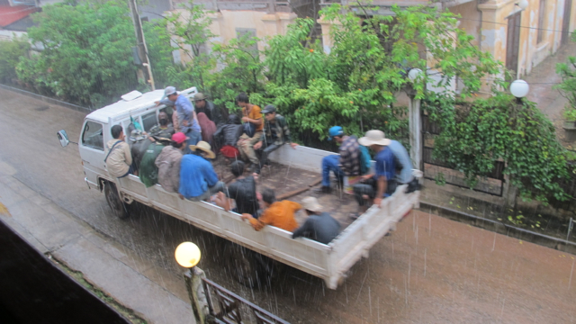 Construction workers ride home in the rain