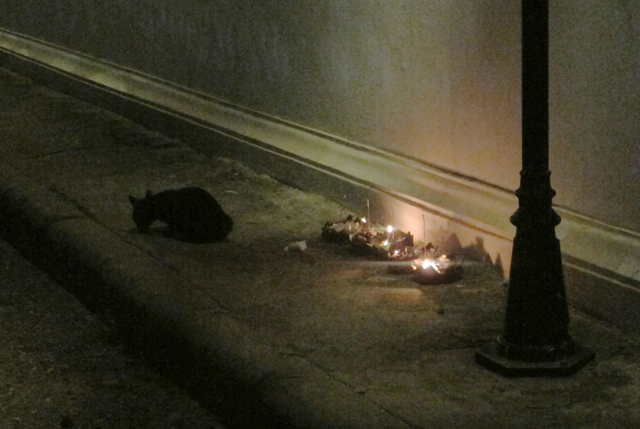 Jacuqe and I woke up around 5:30 am that day in hopes of seeing something interesting in the morning. But the dark streets were quiet. We came across a few candles burning on the ground alongside offerings at the side of one temple – and a cat who seemed quite content eating the offerings placed at his level. (A spirit incarnate, maybe?) There were more offerings clustered outside the temple gates, little boats with candles flickering beside them. Later that day, Sinsamout brought flowers for our office spirit house and some delicious offerings his mom had made for the occasion – sweet sticky rice and bananas wrapped in banana leaves. Luckily, we got to sample them after they had been offered!