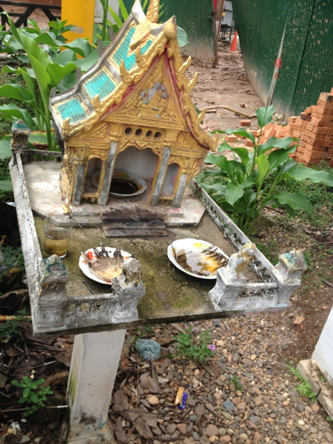 The most obvious evidence of this are the little houses seen outside almost every Lao business or residence. At first I thought these little altars were a Buddhist tradition. I wasn’t quite sure how to describe them – an altar? A shrine? The most fitting term I finally came across is “spirit house.” These structures are basically a place to make offerings to the spirit of your home or workplace – essentially, trying to appease it and keep it happy so it doesn’t wreak havoc on your life and fortunes.