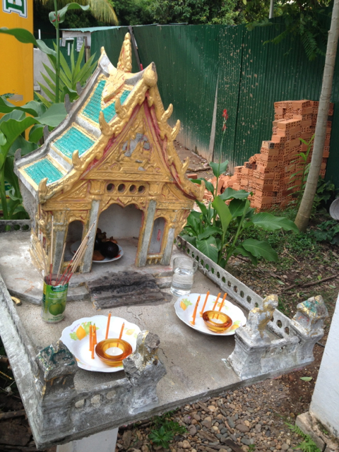 My office has a spirit house of its own, and when I finally noticed it, it was clear that it needed some TLC. One hot afternoon, I scrubbed down the moss and mildew – a bit of a delicate operation, since the flaking paint was readily coming off in the process. Once we got it tided up and picked up the garbage that had accumulated around it, Jacque and I made a few small offerings of candles, incense, and fruit to our spirit house. I’ve also seen