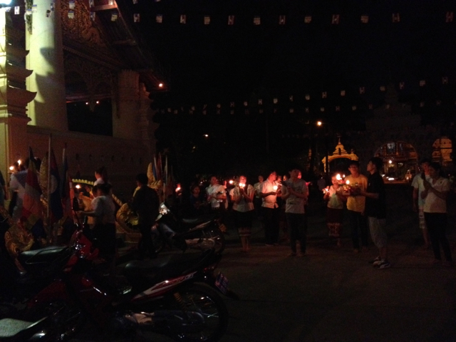 As evening rolled around, Jacque and I heard a steady drumming and chanting coming from one of the temples down the road. We wandered over just in time to witness a beautiful sight – monks finishing a candlelit procession around the temple, with dozens of community members following behind. Sinsamout later told us they walk around the temple three times. People then took their candles to various parts of the temple grounds, setting them and other offerings next to trees and stupas. Everyone then crowded into the temple where the monks chanted and prayed.
